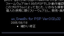 | uo_Snes9x for PSP | SFC/SNES | y氏作のSNESエミュレーター。266/333MHz切り替え機能など多機能。 |