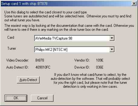 (4)DScaler 4を立ち上げて、TVキャプチャーの設定を行う(図1-2参照) 以下の設定は一例です。各種ボードによって違います。 図1-2 BT878用セットアップ