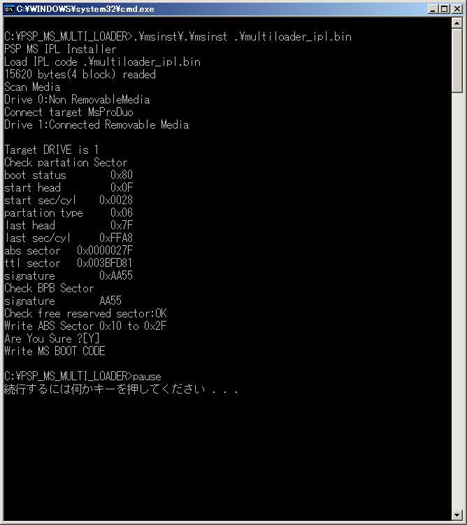 ●導入手順 (1)メモリースティックPro DuoをPSPに入れておく (2)PC上でMS MultiLoader IPLのファイルを解凍し、install_psp_ms_multi_loader_ipl.cmdをダブルクリックする(この時ログインしている ユーザーはAdministratorもしくはその権限を持つユーザーであること)