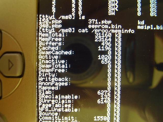 エディタとしてのviもあり、普通に使うコマンドも色々と入力対応されていて、ちょっとしたポータブルLinuxという感じですね。/proc/以下の 情報もとりあえずcpuは微妙っぽいものの、meminfoも旧型PSPの32MBをしっかり認識していて良い感じです。難点としては現在の所リモート ポートに接続して乗り込めるものの、IR接続のキーボードドライバがまだ準備されていないために入力は実質OSKという点ですかね。Tabによる 入力補完があるのでちょっと楽出来ますが、少し長いコマンドを叩く時は流石に辛いです。是非ともpalmのキーボードに対応して欲しいですね。