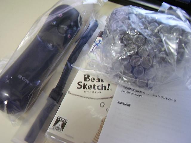 ●開けてみた 中身はこんな感じです。モーションコントローラ、ストラップ、Playstation Eye、Beat Sketchが同梱されております。