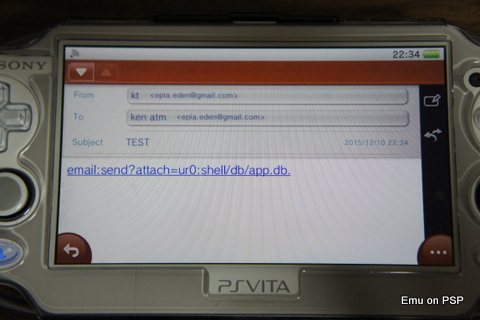 (9)ファイルを保存する (10)いじったapp.dbを #0 とリネームをして、件名: ur0:shell/db/app.db としたメールを作成して #0を添付してPS Vitaへ送付する