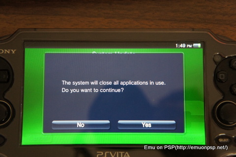 (6)PS Vitaに電源ケーブルを接続すると、自動で起動してくる (7)ここで勝手にWiFiに繋いでファームウェアアップデートを行おうとするので即座にキャンセルする (8)キャンセル後、DEMO Modeになっているはず