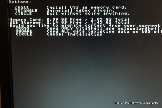 (4)電源ON後、再度usbmcのインストーラを起動する。すると今度はuma0:から内蔵メモリ(ux0:)としてみせるための インストールに切り替わる。各種動作は下記の通り。今回はまるごとコピーのため、□ボタンを押して勧めた Xボタン - Vitashell/molecular shellのみをインストール □ボタン - 現在の内蔵メモリのファイルを全てコピーする ○ボタン - インストール中止