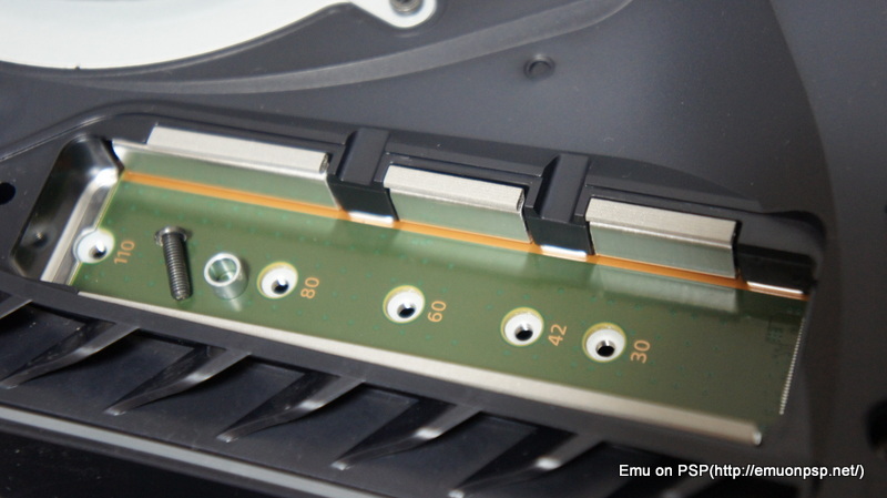 (2)最初は110(22110サイズ)に設定されているので、ネジを外して用意したM2のサイズに合わせる。今回は2280サイズなので、80とした